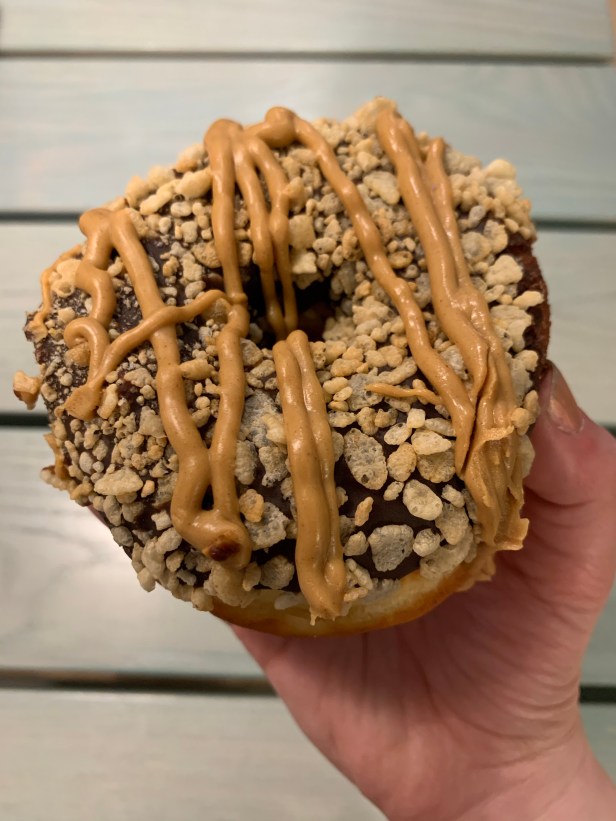 Ok. This lil heart-shaped Earth donut is super adorable so I had to get it (even after I asked what it was and was told that it was full of lemon and orange cream- I don’t hate lemon, I do hate orange). I couldn’t remember the name of it and it’s not on Voodoo’s or CityWalk’s website, so I scrolled through Instagram for quite a few minutes trying to find it. Someone posted a video of the bakery case and this one didn’t have a name label below it, so maybe it just doesn’t have a name. REGARDLESS, this surprised me! Raised yeast donuts are my favorite so I was excited for that aspect of it, but nervous about other aspects- as I mentioned, I hate orange and this had some orange flavor. When eating this, though, I got way more of a creamy lemon taste, like lemon curd folded into whipped cream with like, a teeny hint of a hint of orange. I liked it a lot! It was a cute balance of bright and sweet. Would get again.