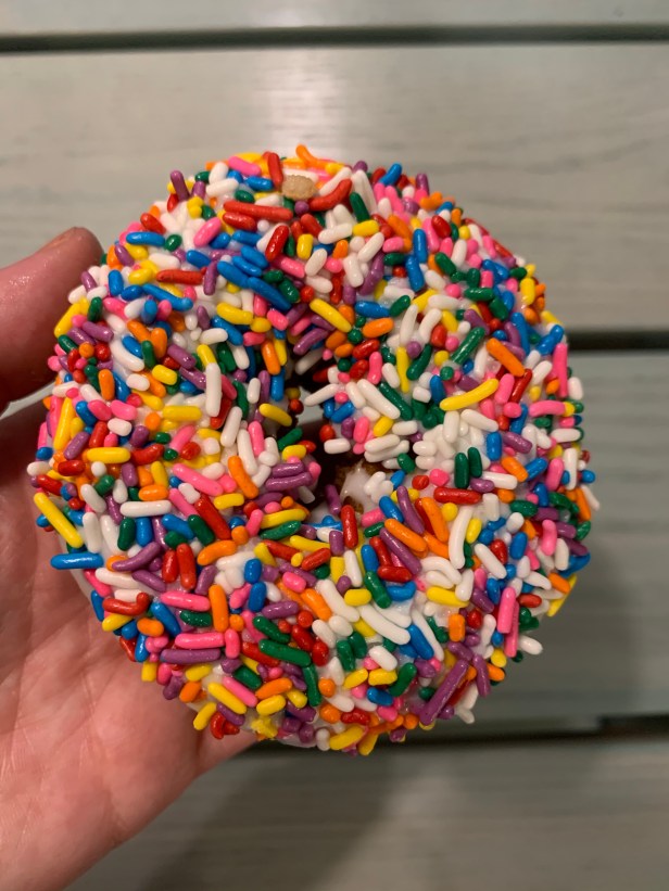 Next (and last- boo!) I tried the Sprinkle Cake, to try a cake donut as well. Cake donuts aren’t my favorite and this wasn’t really an exception to that. Cake donuts are best to have with coffee or milk, as they are pretty dry. I also wanted this to taste birthday cake-y but it was just plain cake with sprinkles. She wasn’t bad though and she was definitely pretty, so I do not regret taking her for a spin. She didn’t wow me, though.
