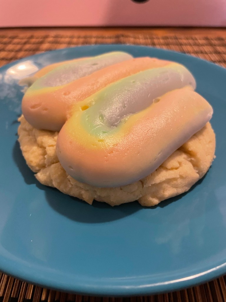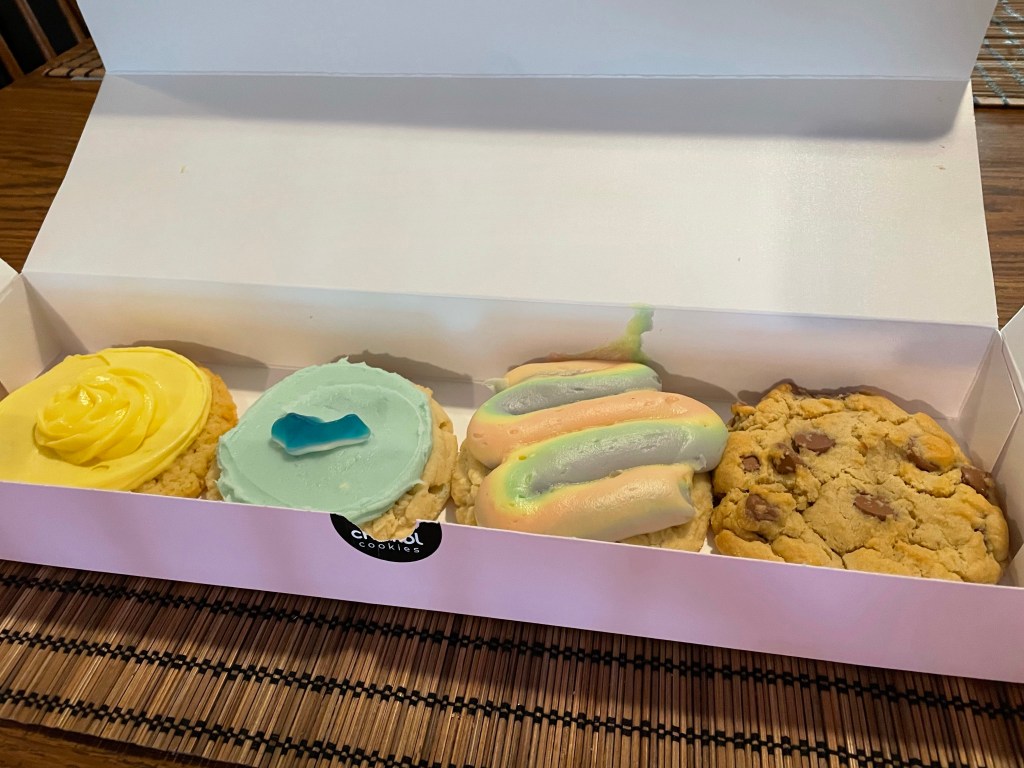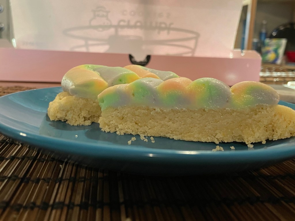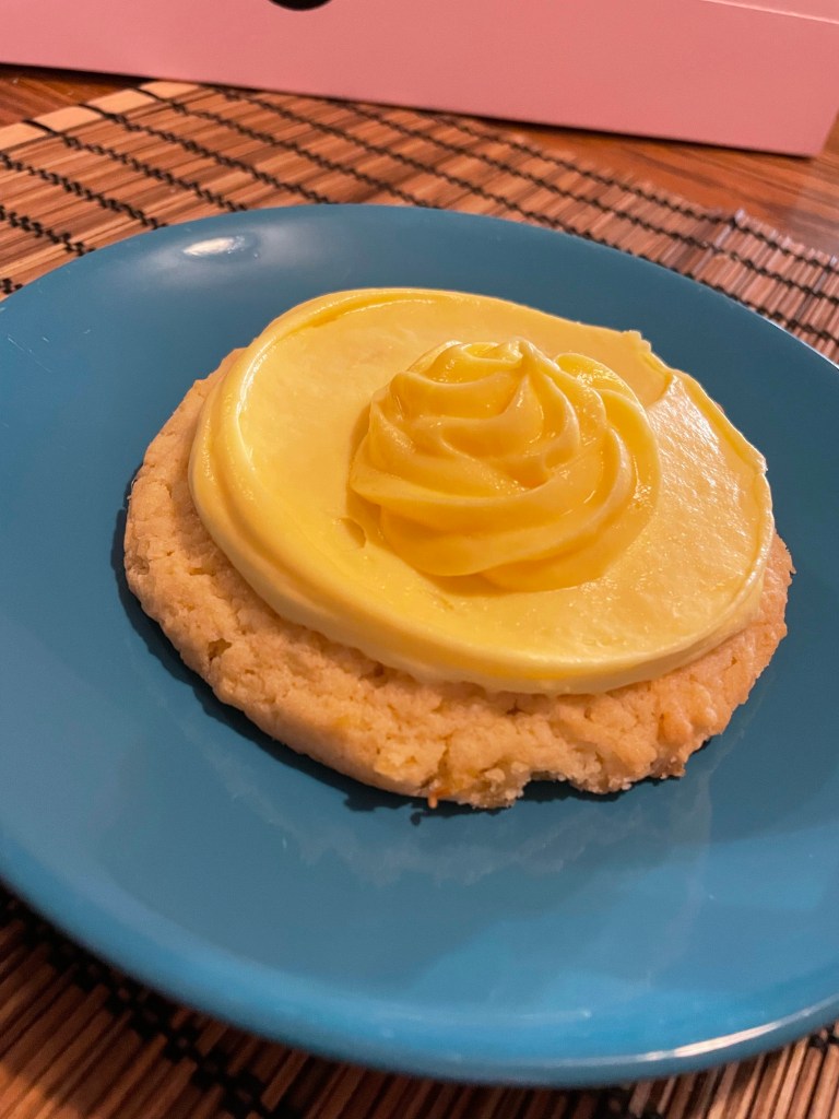 Lastly……. my favorite. I will be thinking about this cookie for days, maybe weeks, maybe months. The Hawaiian rainbow cake cookie was a cake batter cookie topped with coconut cream cheese icing. I did not know what to expect with this but holy shifkjgnajdnffucfgjneargk. The coconut flavor was more of a toasted coconut, with a warm and creamy vibe. It was also extremely adorable. The cookie wasn’t super special on it’s own. The icing is the star of the show with this one. Wow. It was really stinking good and I’d definitely recommend you try it.