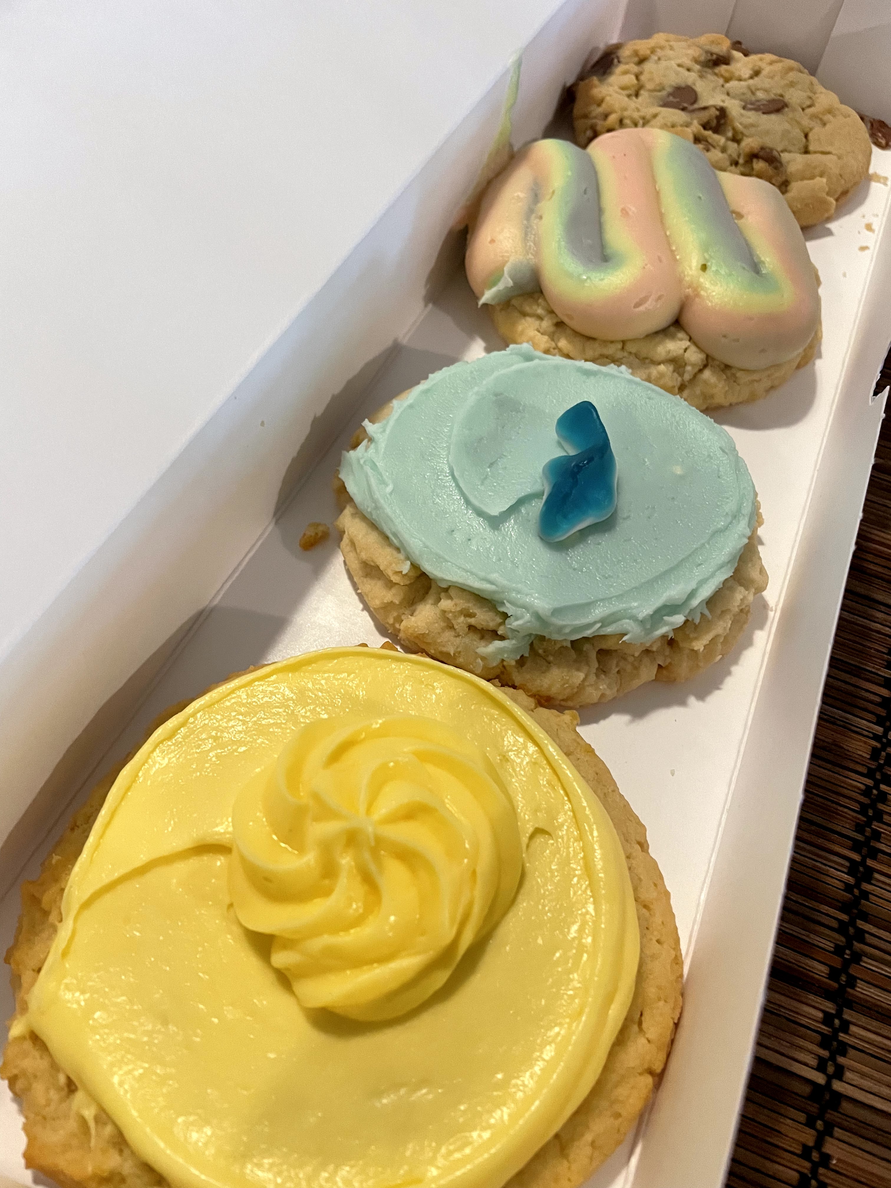 These cookies were even more beautiful (and delicious) than expected, tbh. I went with a four-pack and picked three from the weekly menu, Hawaiian Rainbow Cake, Pineapple Whip and Shark. The other options were hazelnut sea salt and white chocolate macadamia nut. White chocolate macadamia nut is usually one of my favorite cookies, but I had all four of my wisdom teeth taken out a few days ago and I felt like that might be a little tough to chew, because macadamia nuts are super crunchy, and I’m not really a hazelnut fan. For those reasons I went with the classic milk chocolate chip that they have every week.