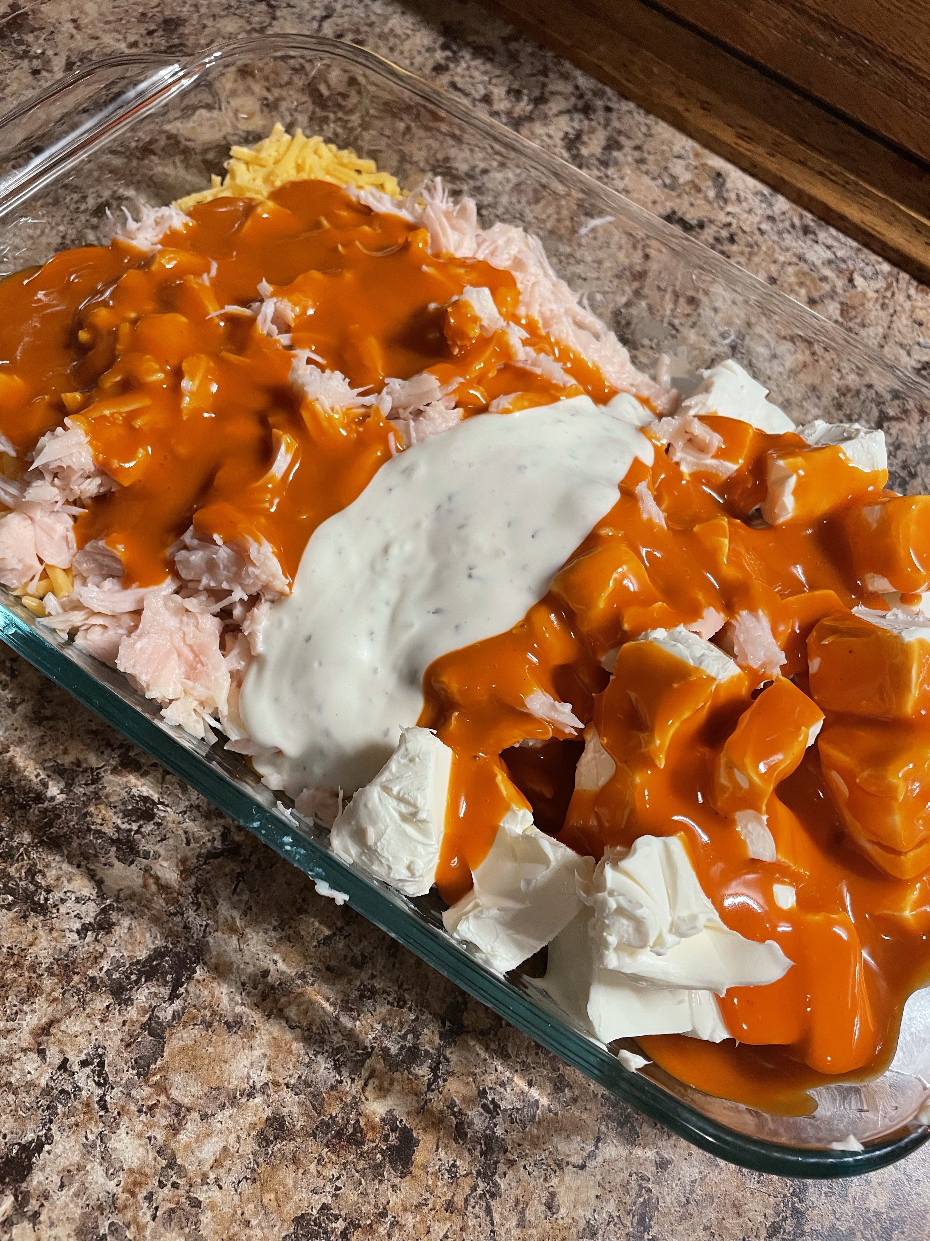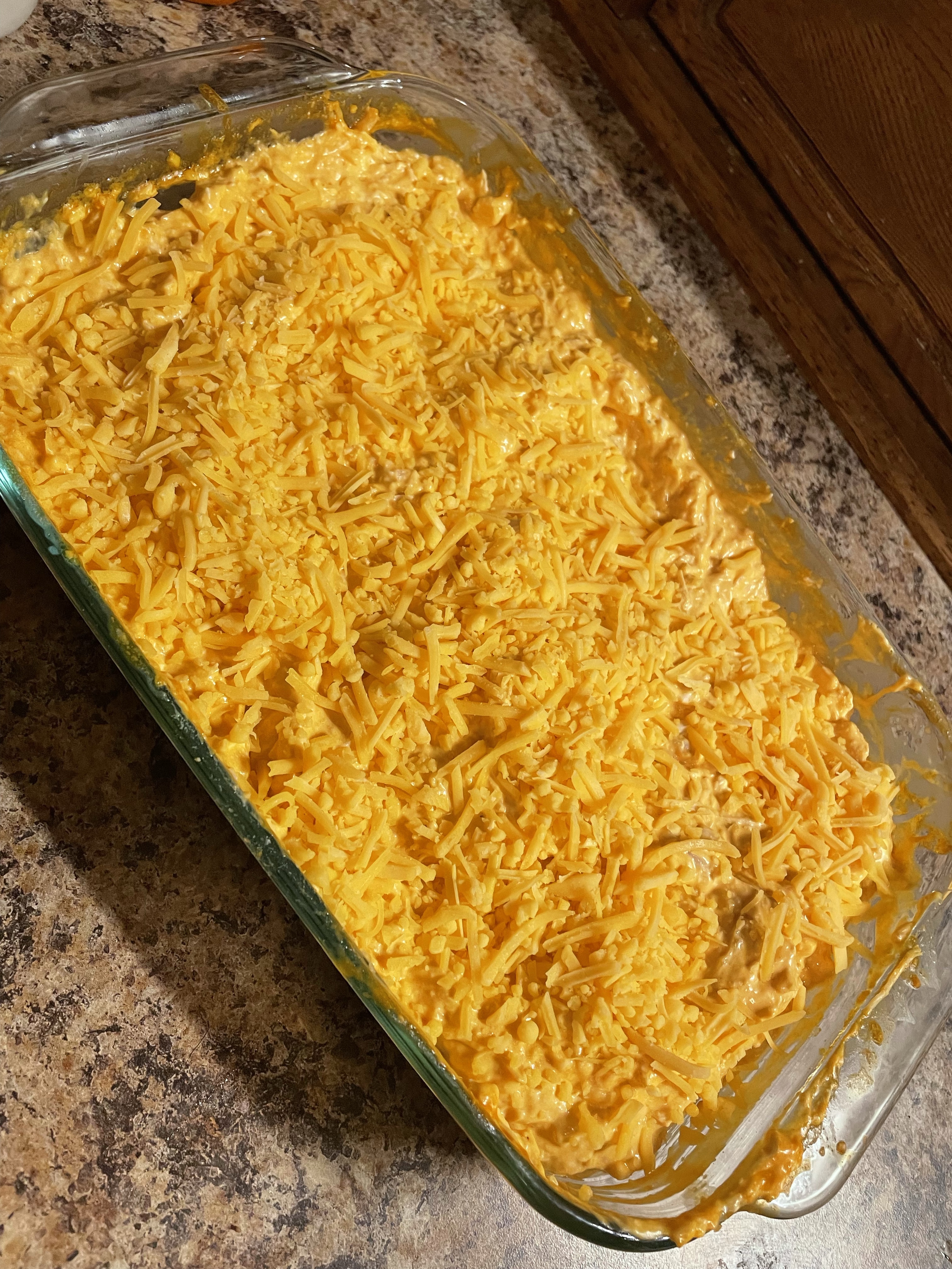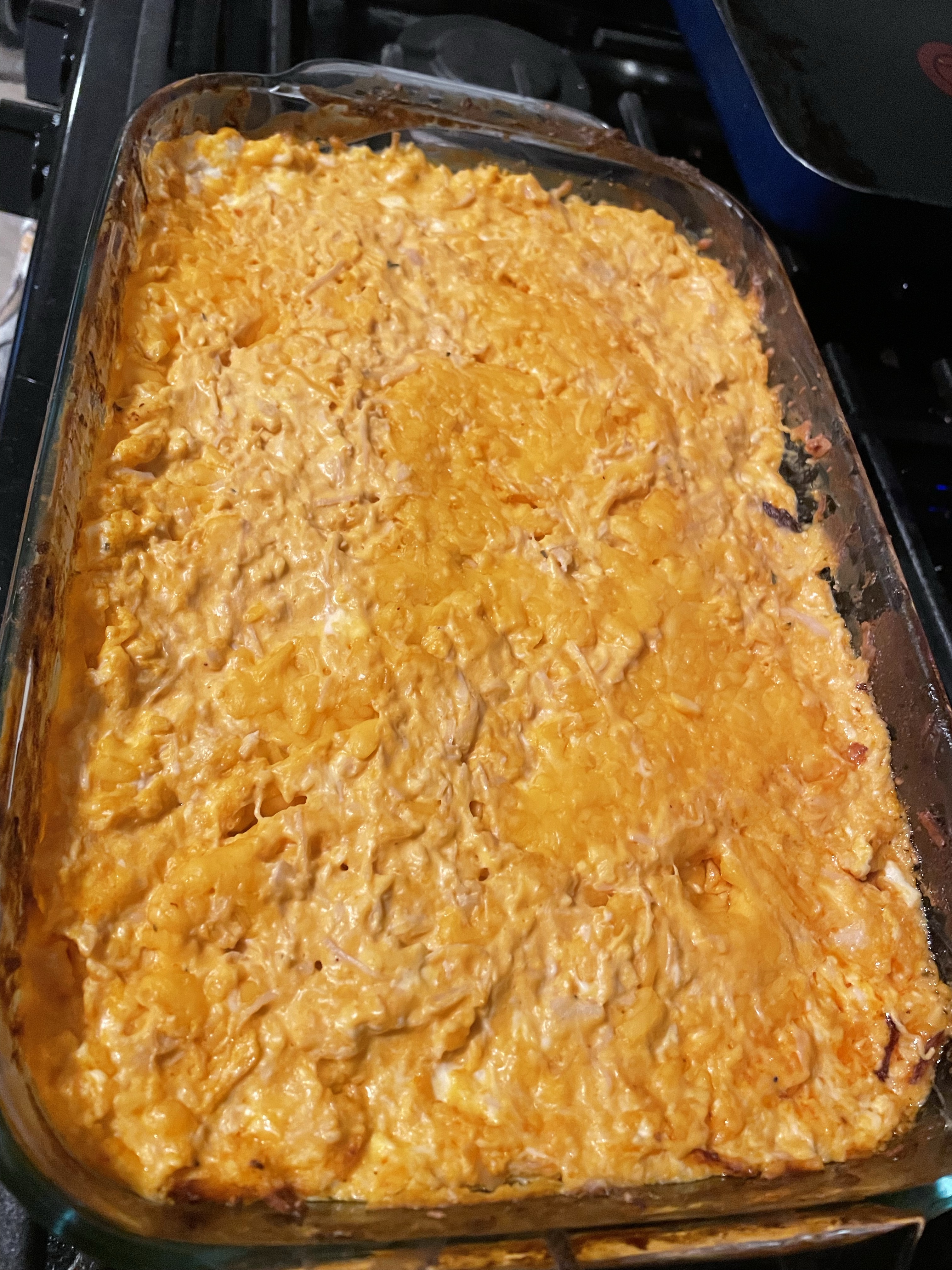Buffalo chicken dip is one of the great snacks that seems like it took a lot of effort but is so easy it doesn’t actually need a recipe. I mix two packages of cream cheese (I cube it so it’s easier to mix), two cans of fully-cooked chunk chicken, half a bag of shredded cheese, about a cup of wing sauce, and a good splash of ranch (or blue cheese I guess, if you’re gross). You can totally use rotisserie chicken or make your own shredded chicken, but I think shredding chicken is the worst so I like using the cans for this lol. For wing sauce, I love the Sweet Baby Ray’s medium buffalo, but you can use whatever sauce you’d like- even regular hot sauce. After mixing well, I top with the rest of the shredded cheese and bake at 350… until I feel emotionally ready to take it out (or until it gets bubbly and the edges brown a little bit, probably 10 minutes). You can serve this with so many things- I did tortilla chips, club crackers, and celery.