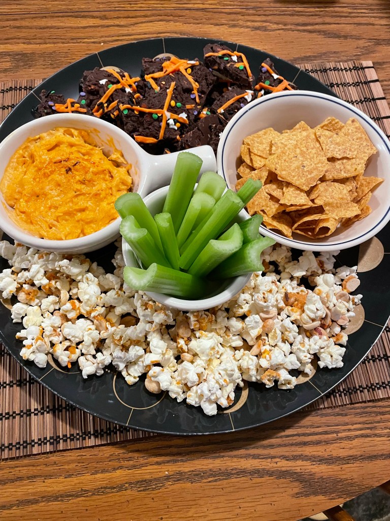 Here is my finished snack platter. Everything on here was delicious, and my fiancé was quite impressed. I’m not sure what could be better than getting comfy on the couch with these snacks and your favorite Halloween movie or show.