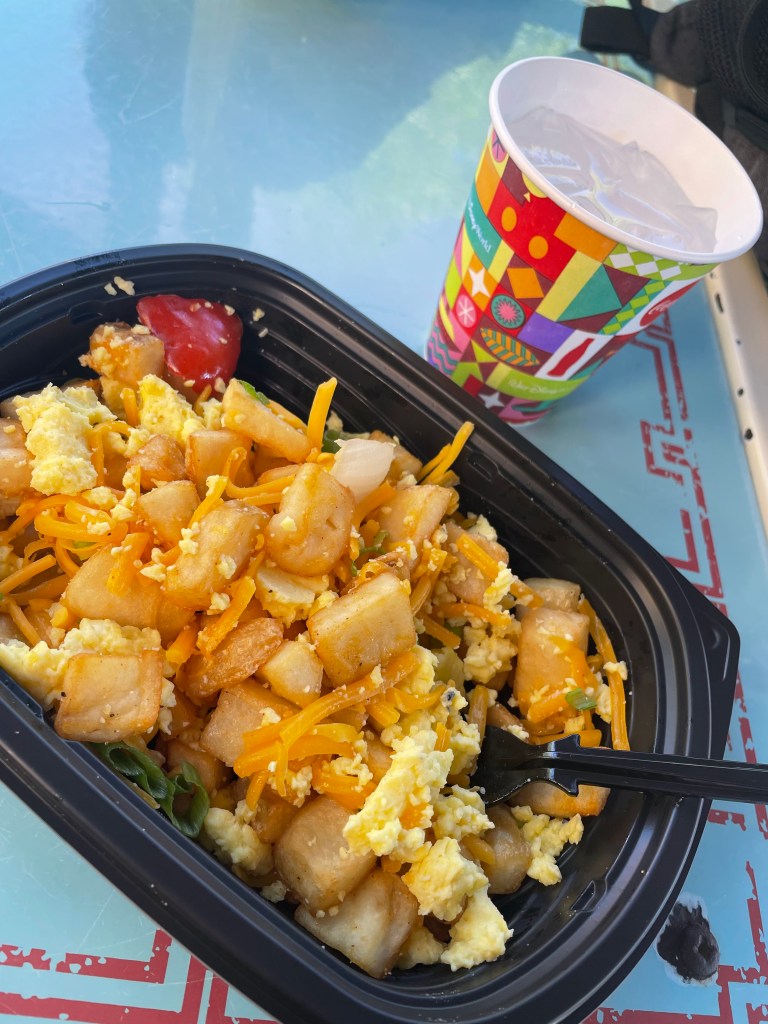 While breakfast the next day wasn’t bad, it wasn’t like, great. In Animal Kingdom, we had breakfast bowls from Yak & Yeti. While they were nutritionally satisfying, they weren’t delicious. Some type of sauce is needed (hot sauce isn’t saucey enough and I was not about to add mayo or ketchup) to make these enjoyable, and they need to be served hotter.