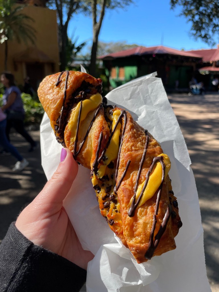If you’re more of a breakfast pastry person, I feel you. First thing in the morning my tummy ain’t ready for a full meal and I like to grab something small and sweet. After working up an appetite (like by going on a nearby roller coaster) I’ll be interested in a larger, more savory breakfast. If you know what I’m talking about, I’m sure you’d be interested to know where to get a good chocolate croissant! This Tiger Tail pastry (found at a cart in the Himalayan section of Animal Kingdom) has a twin at Magic Kingdom as well (called the Cheshire Cat Tail, served at Cheshire Café). I’ve shared my feelings on this treat before, but I here want to emphasize my conclusive statement that it’s a chocolate croissant that has nothing wrong with it.