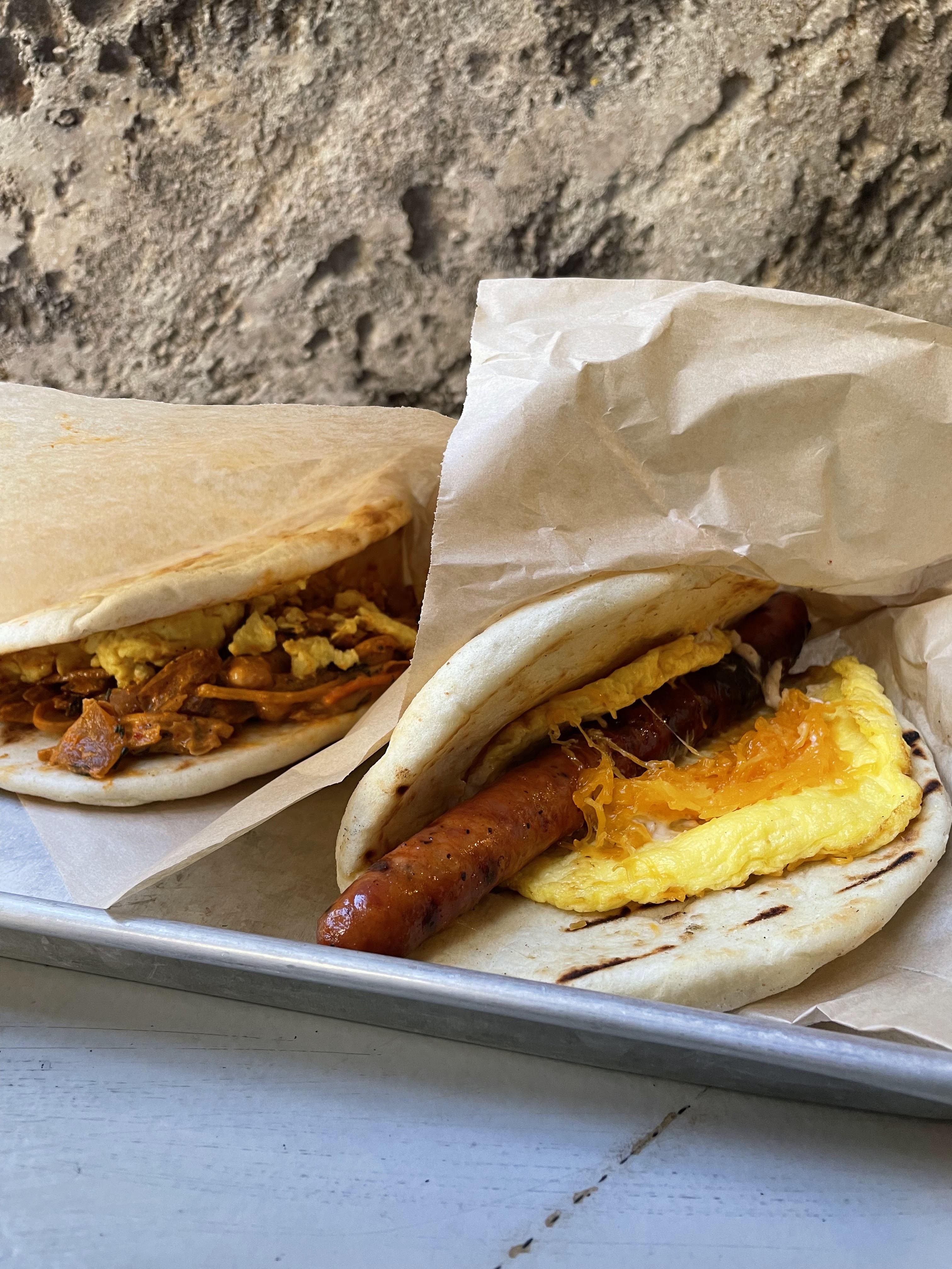 Triple Suns is the plant-based wrap, and it’s pictured above on the left. The pita wrap is filled with an egg substitute, roasted tomato sauce, and a chickpea-onion slaw. It has a good flavor, but is super mushy. I left the last few bites because the mushiness became overwhelming. The Ronto Morning wrap was as great as you’d think. How could scrambled eggs, grilled sausage, cheddar cheese, and peppercorn sauce in a pita be bad?